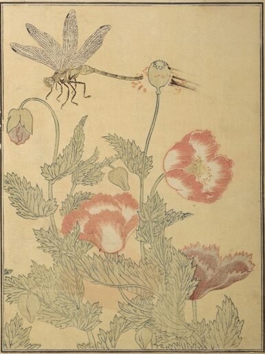 Utamaro was famous for his “picture book of insects”. He was not just a Bijin-ga (Ukiyo-e featuring beautiful women) artist. Click the images below to scroll view his amazingly detailed depiction of insects. There is a butterfy, a dragonfly and a grasshopper. They are shown among flowers and grass, attesting to Utamaro’s love of nature. The insects were common in Japanese cities in the 18th century, but not so common nowadays due to over industrialization.
