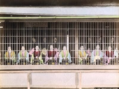 - Standing Prostitute and Kamuro. Circa 1805. This is a glimpse into the elegant world of the Yoshiwara pleasure district in Edo (present day Tokyo). Famous courtesans and their attendants of that period were like modern day celebrities. Personalities to envy. In the center is the standing prostitute or top rank courtesan (oiran). Beautifully dressed, representing beauty and luxury, adorned in elaborate kimonos, hair and makeup. At her side is her attendant, a young girl maybe 10-13 years old, called the Kamuro. She rans errands, assists with the courtesan’s hair or makeup and learns the ropes. Maybe she will be a future Oiran herself. This is moment in the everyday life of a top ranked courtesan of Yoshiwara.