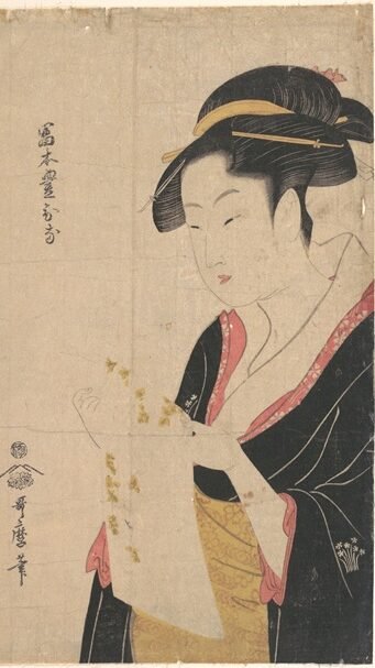 Kitagawa Utamaro (?–1806) was a renowned Japanese artist of Ukiyo-e woodblock prints and paintings. His contribution to the Ukiyo-e world was the introduction of bijin ōkubi-e “pictures of beautiful women from the waist up”. He was also famous for his nature studies, particularly his exquisitely detailed book of insects. It is not known where he was born but his childhood teacher was Sekien, a Japanese painter of the upper-class Kanō school who later became a Ukiyo-e artist. In the beginning, Utamaro worked as an illustrator of popular literature, but in 1782 met a young publisher named Tsutaya Jūzaburō and started working with him. This was crucial. A Ukiyo-e woodblok print needs an artist to provide the original design, a carver to carve wood, an inker, a printer to press ink onto the paper. If the print is multi colored, multiple woodblocks have to be carved. With the coorperation of Tsutaya, the finest woodblock printing team could be assembled. Tsutaya would become a major publisher in his own right. In the 1790s Utamaro reinvented himself. He distanced himself from illustrations and concentrated on making single portraits of women displayed from the waist up. This was a break from tradition in that previous Ukiyo-e artists had concentrated on prints of women in groups. This focus on the upper body made the woman’s face more prominent. Utamaro could take advantage to capture the inner beauty and personalities of the woman. This was a success and he became a recognized artist. He made a series of well-known works, featuring women in the Yoshiwara district. Utamaro was imprisonned by the authorities for producing politically sensitive Ukiyo-e in 1804 and died in 1806. In sum, he was the pre-eminent Ukiyo-e artist in the 1790s and left over 2000 known prints. Utamaro’s work reached Europe in th 1880s and influenced European painters such as Monet, Degas and Gauguin.