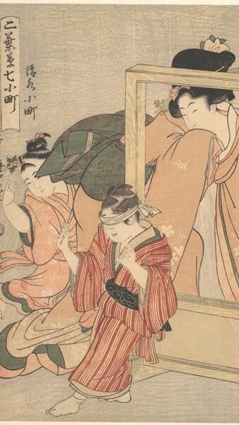 - Kiyomizu Komachi. 1790s. A beautiful woman observing two children playing blindman’s buff. We can see that the children are engrossed in the game while the woman looks on. The genius of Utamaro brings to life a domestic scene that makes us smile. There is another connotation. In the title the word “Komachi” refers to esteemed and beautiful woman. Once upon a time in 9th century Japan there was an ancient poet celebrated for her literary talent and beauty. Her name was Ono no Komachi. “Komachi” harks back to her. So this is a domestic scene where an esteemed and beautiful woman is looking after two children.