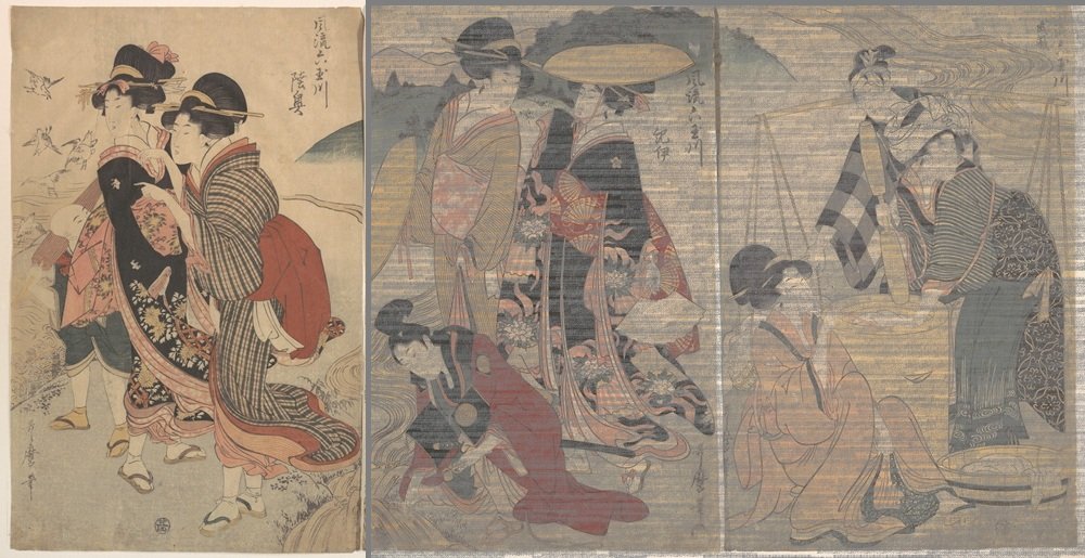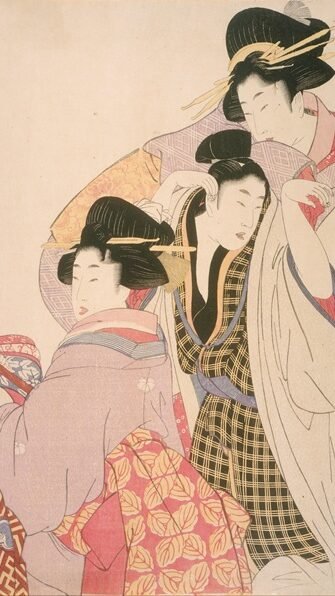 - Two Beauties with Bamboo. Circa 1795. This shows two women, probably courtesans wearing kimonos with patterns akin to water and bamboos. Elegant and stylish with elongated features and intricate details that emphasise the beauty and grace of the women..