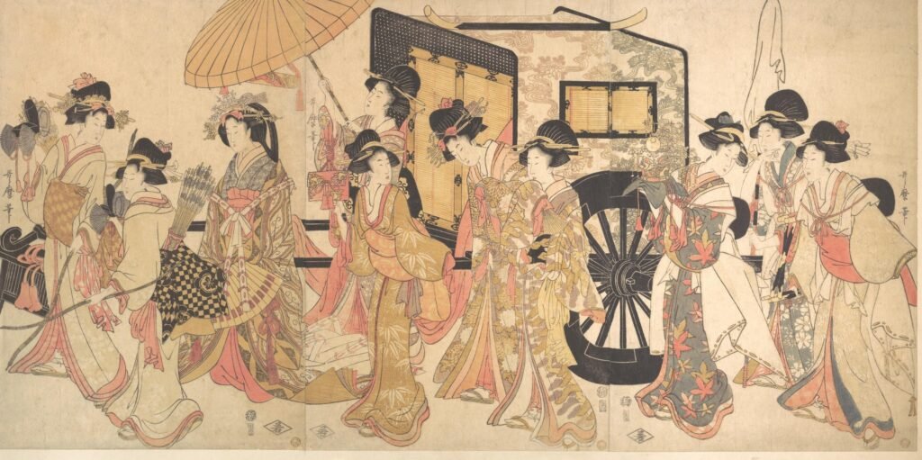 - Courtesan in Procession. This is an “Oiran Dōchū”. A top ranked courtesan (Oiran) is parading in full dress mode in the streets of Yoshiwara. Exquisite kimono, perfect coiffure, a symbol of refined luxury. And she wasn’t just beautiful. She was a master of music, dance, calligraphy, and fashion. This was meant to showcases her beauty,refinement and the prosperity her teahouse to propective customers. The “Oiran Dōchū” is still recreated in present day Japan as a tourist attraction.