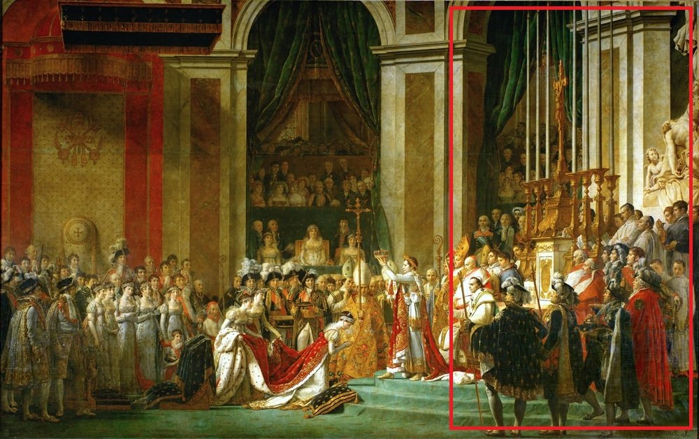 This was commisioned by Napoleon Bonaparte who became Emperor in 1804 and is meant to glorify Napoleon and the Napoleon Dynasty. Napoleon is in the center in robes similar to the emperors of ancient Rome. He holds a crown that he places on the head of his wife Joséphine de Beauharnais. The Pope Pius VII just stands there giving his blessing to the ceremony. Napoleon’s mother is in the stands but she is in a better position than the pope. Napoleon’s brothers are also there. Louis Napoleon, King of Holland, Joseph Napoleon, King of Naples. His sisters also in the front.